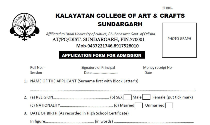 The procedure of admission of BVA course student seeking admission in to the Art college must apply on a prescribed from available from the office of the college from 1st of June (please contact the college to know admission from for this year) of every year onwards on payment of Rs 200/- in cash payable to the principal kalayatan college of Art & crafts sundargarh.770001 odisha. Mob-9437221746,9861336923,9178509526. Or They can download the admission from directly from the below given link in the amount of Rs 300/- (with DD & ammo) while submitting the from in the college office. Download the admission form & prospectus